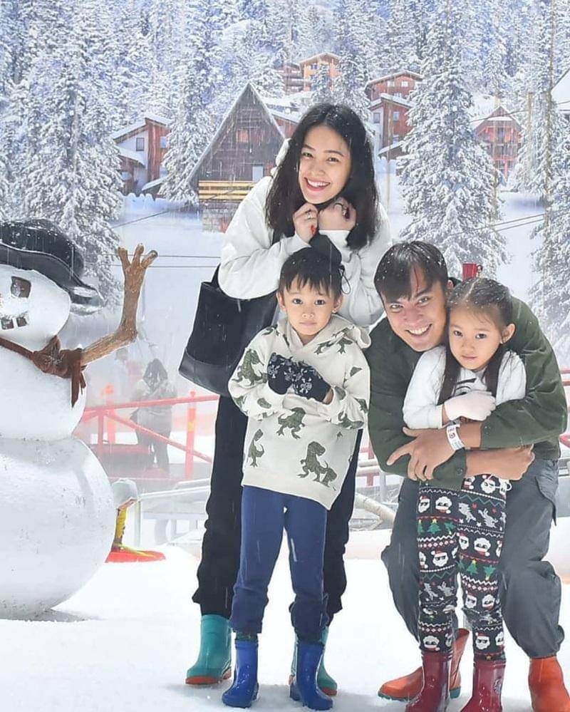 Seperti yang dilakukan oleh keluarga ini saat liburan. Mereka berfoto berempat dengan outfit winter dan latar salju.