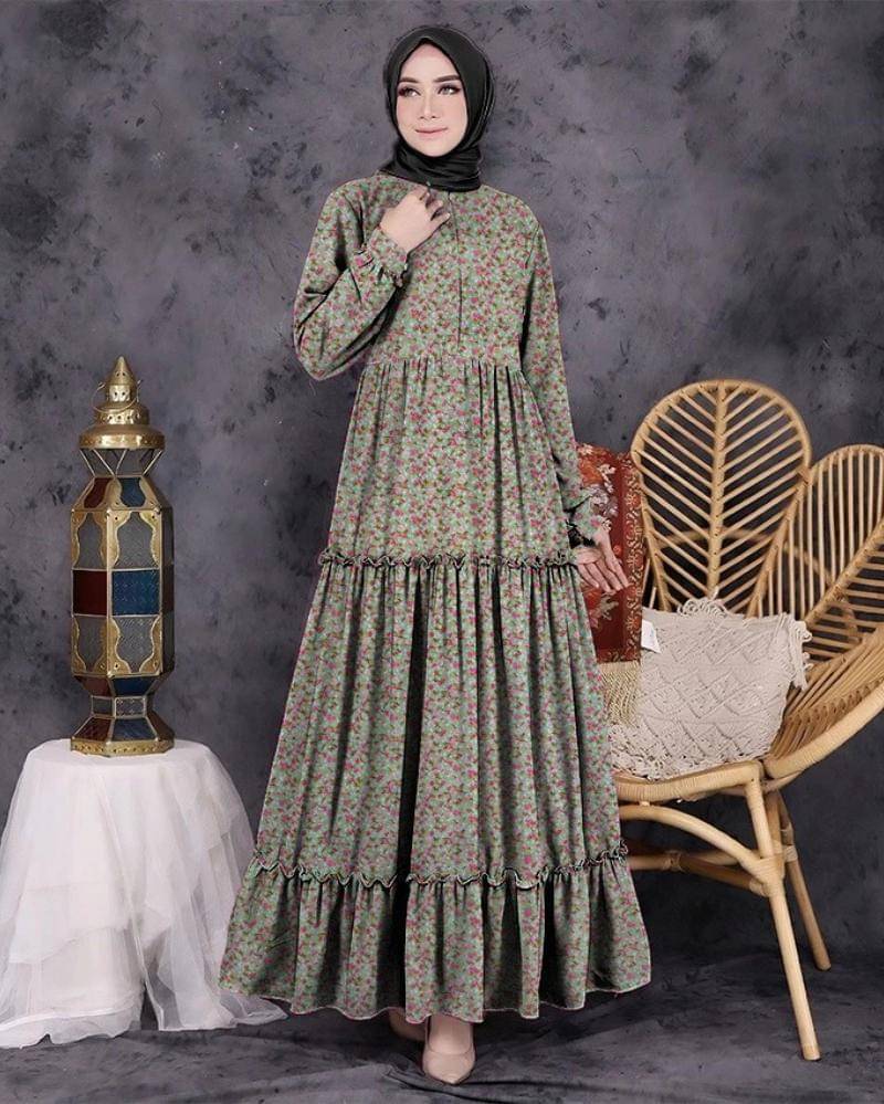 Mama bisa memilih motif floral dengan warna yang senada untuk menciptakan kesan harmonis. Gamis ini cocok untuk Mama padukan dengan hijab warna senada dan sedikit tambahan aksesori minimalis untuk melengkapi penampilan Mama saat Lebaran.