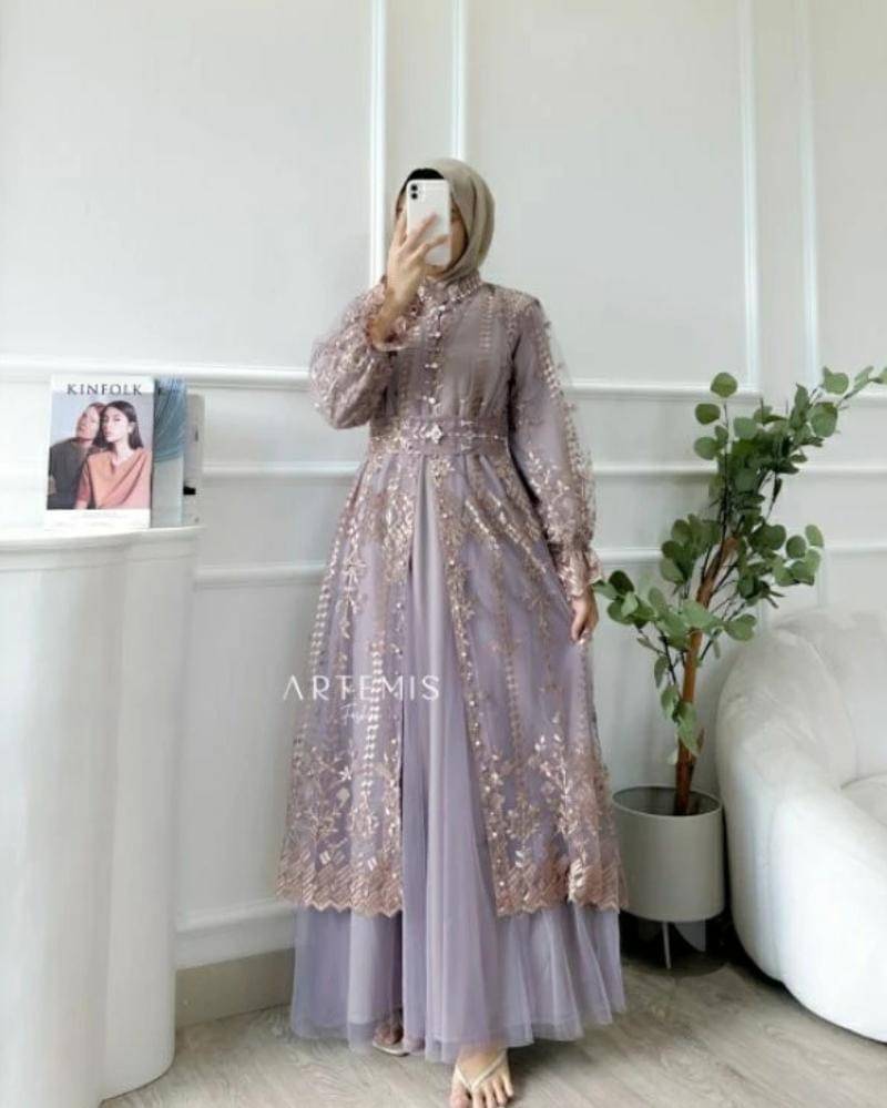 Motif floral selalu menjadi pilihan favorit banyak perempuan untuk menambah kesan yang fresh dan playful, terutama saat Hari Raya. Gamis mariposa dengan motif bunga-bunga kecil dalam nuansa pastel memberikan Mama tampilan yang youthful dan stylish.