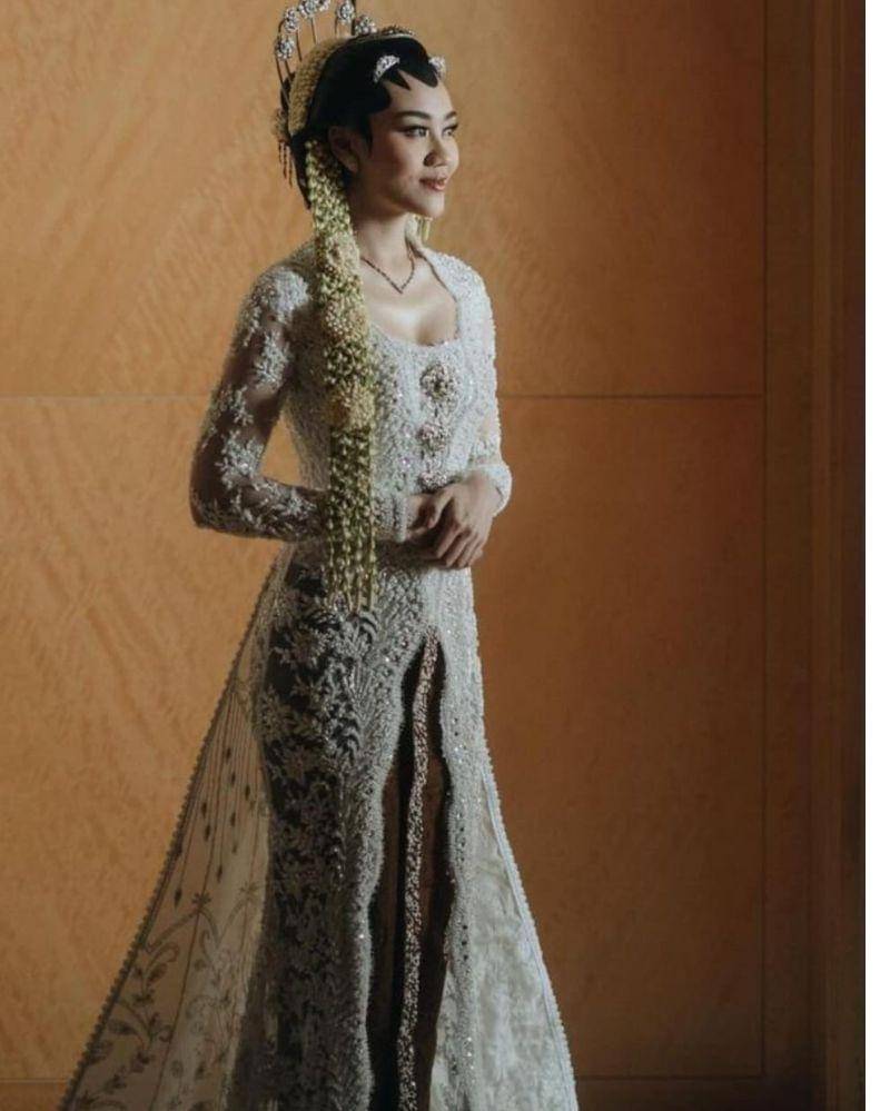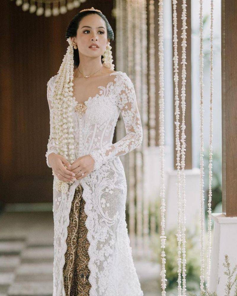 Carissa Putri, memilih kebaya adat Jawa putih saat akad nikahnya. Dihiasi bros dan aksesori monte melati di kepala, kebaya ini memberikan kesan elegan dan membuat tubuhnya terlihat lebih langsing.