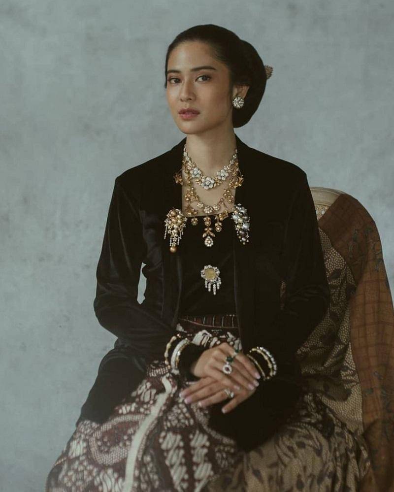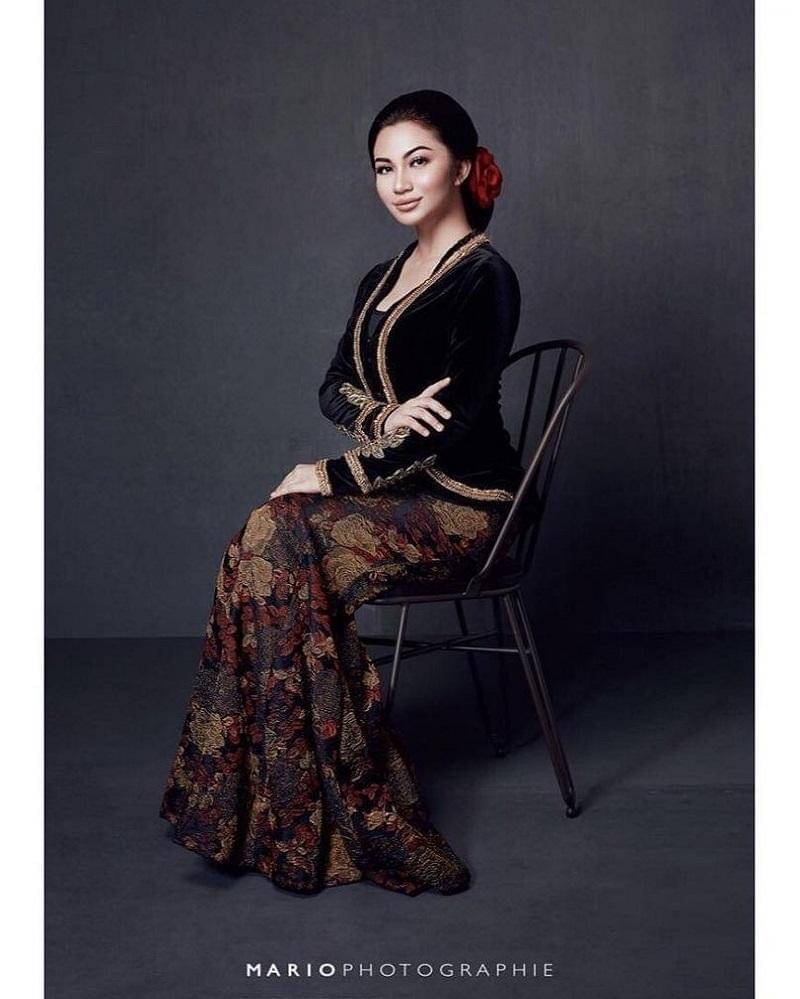 Dengan wajahnya yang ayu, Ariel Tatum terlihat cocok mengenakan kebaya dan kain batik. Ia menggunakan kebaya kutubaru hitam berbahan beludru.