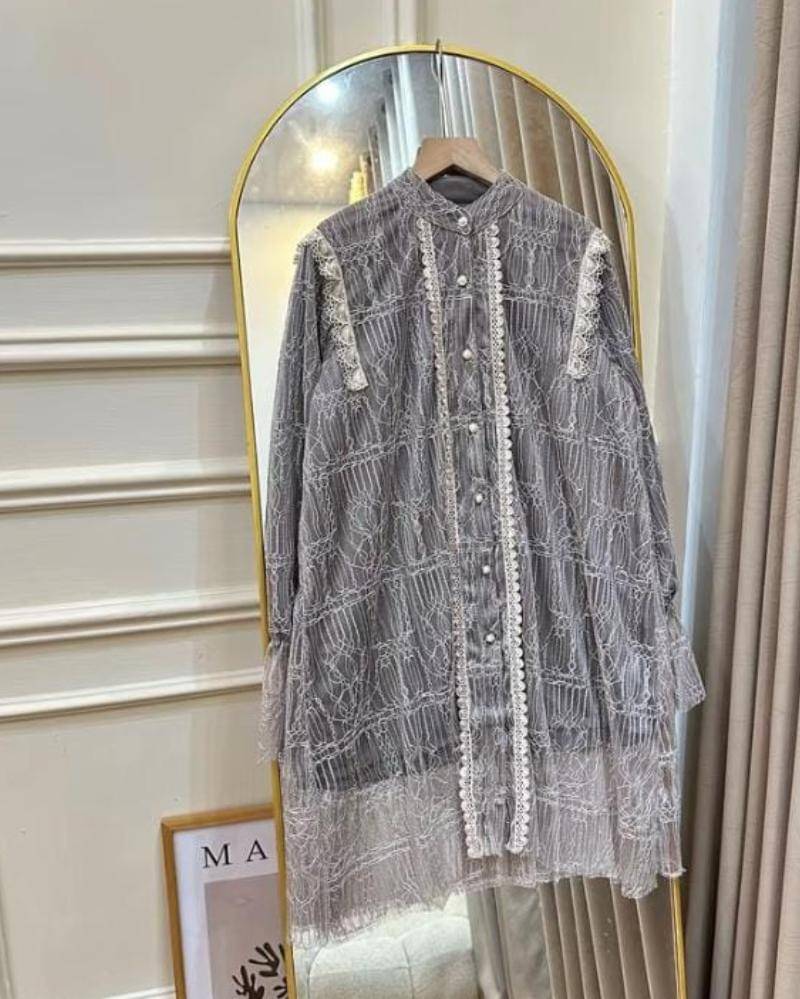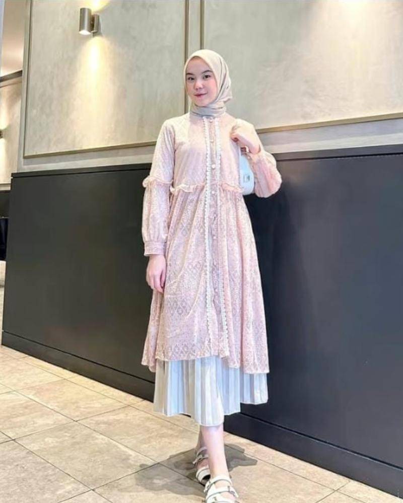 Inspirasi tunik selanjutnya adalah tunik yang terbuat dari bahan brukat tulle, memberikan sentuhan elegan dan mewah pada penampilan Mama di hari Lebaran.