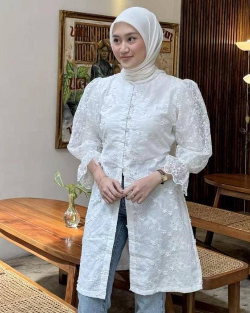Tunik ini terbuat dari bahan katun bordir yang berkualitas, dipadukan dengan sentuhan lace di bagian lengan yang menambah kesan feminin dan mewah.