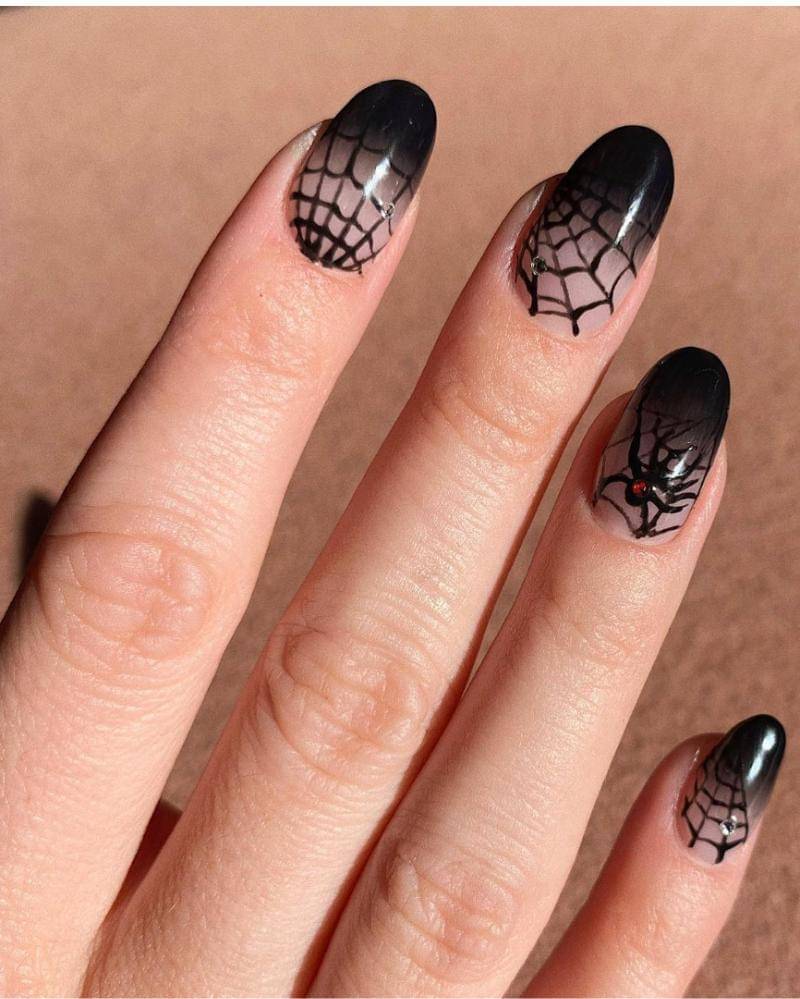 Ujung kuku yang menyerupai jaring laba-laba, dengan gradien warna yang tambah terang, merupakan desain yang sempurna untuk Halloween tahun ini. Desain yang khas memberikan kesan Halloween yang menonjol.