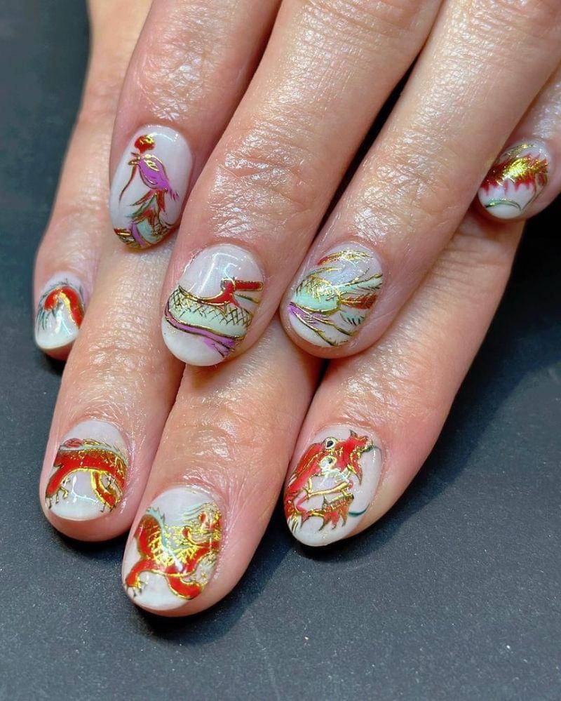 Agar terlihat stunning, pilihlah warna base coat kuku dengan warna nude atau putih. Barulah bentuk gambar naga dengan hiasan merah serta emas. Mama juga bisa membuatnya secara 3D.
