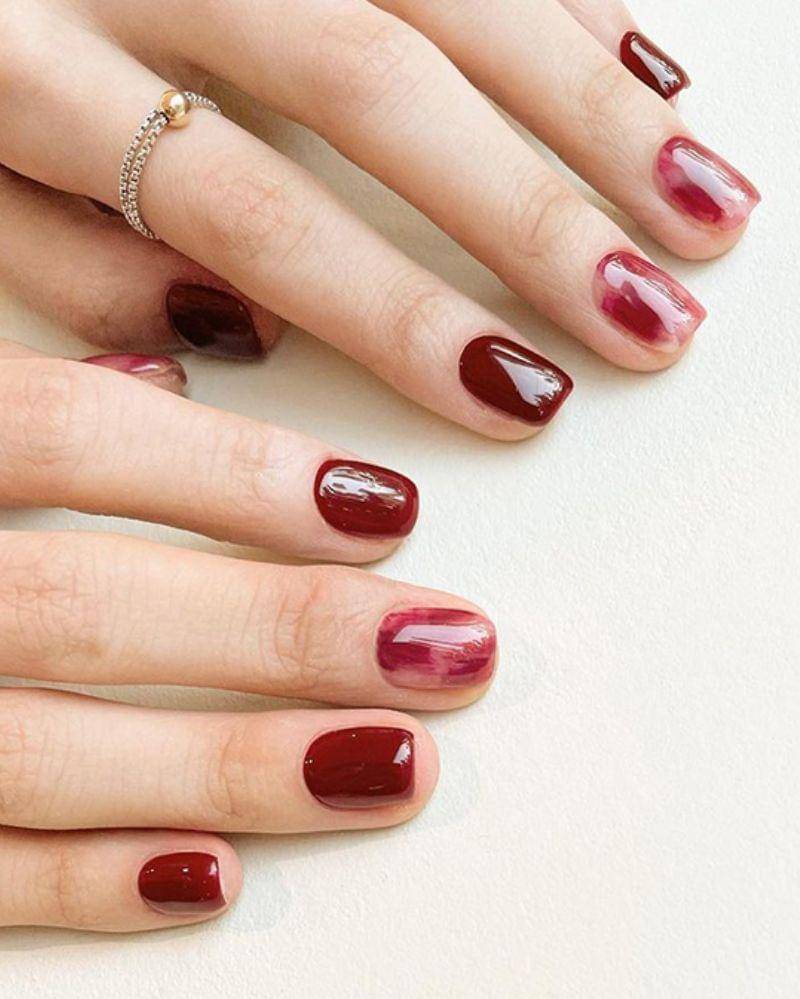 Cara menciptakan warna red marbled yakni dengan campuran warna merah dan putih yang hasilkan warna maroon. Mama bisa mengaplikasikan warna marble di seluruh kuku atau kuku tertentu sesuai selera.