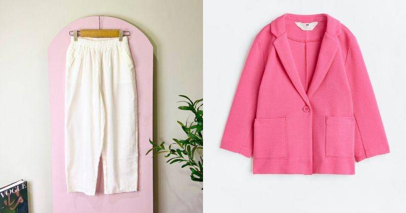 Jika tertarik dengan style ini, Mama dapat membeli celana kulot putih di Shopee Praya.clo serta blazer merah muda di situs resmi H&M.