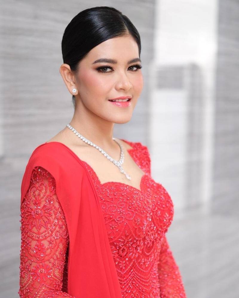 Selain itu, pilihan kalung berliontin ini juga menciptakan kesan elegan yang selaras dengan kebaya merah yang dikenakannya.