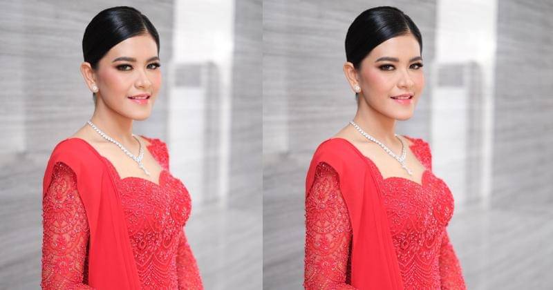 Pilihan warna merah yang mencolok dan detail hiasan beads menambah daya tarik kebaya yang dikenakannya, membuatnya tampak semakin anggun dan elegan.
