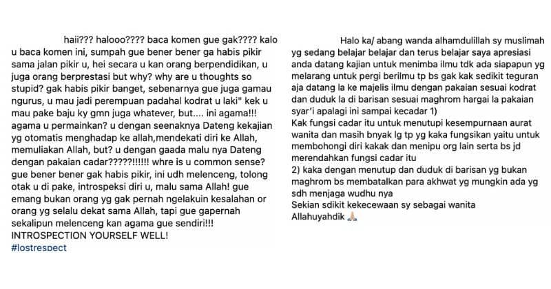Ingin menyebarkan momen spesial, unggahan di InstaStory Syahnaz justru menjadi pisau tajam bagi Wanda. Alasannya adalah karena terlihat busana yang tidak sesuai dikenakan oleh Wanda. Publik berpendapat Wanda Hara tidak seharusnya mengenakan hijab dan cadar.