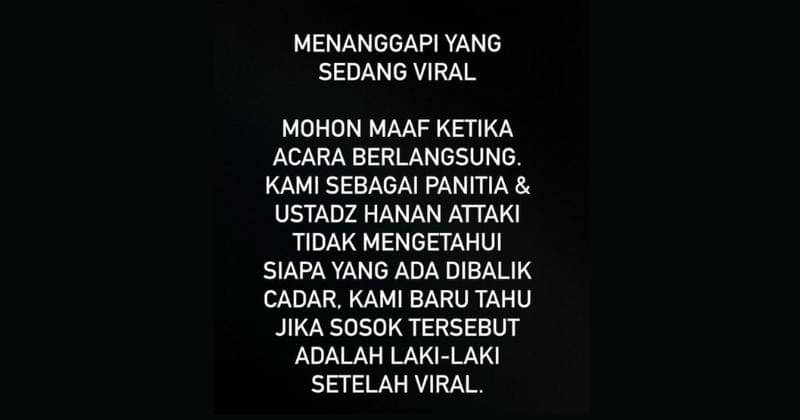 Karena keramaian yang terus berlangsung, pihak panitia kajian, segera mengeluarkan pernyataan melalui akun Instagram @ayah_amanah. Mereka menyampaikan permohonan maaf, dan mengakui bahwa saat acara berlangsung, mereka tidak menyadari bahwa sosok di balik cadar tersebut adalah seorang laki-laki. Mereka baru mengetahui karena viralnya unggahan di medsos.