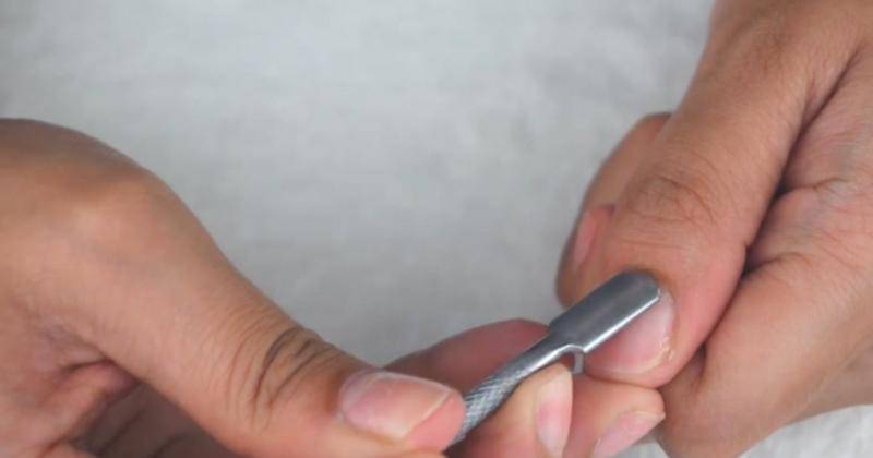 Langkah selanjutnya yaitu mendorong ke bagian dalam kuku, untuk memberi ruang yang lebih lebar sebelum penempatan kuku palsu dan agar kuku palsu terlihat lebih natural.