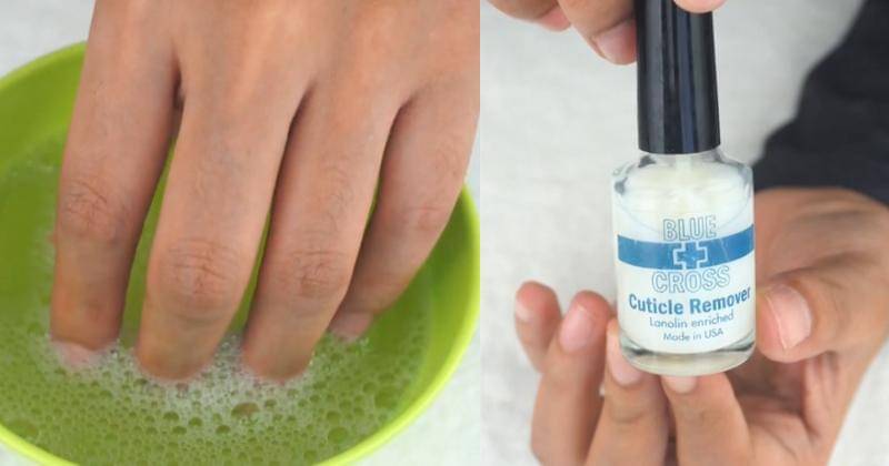 Cara mudah untuk membersihkan kuku adalah dengan cara merendamnya di air hangat dan sedikit facial wash, atau dengan menggunakan cuticle remover. Kemudian tunggu hingga 10 sampai 15 menit.