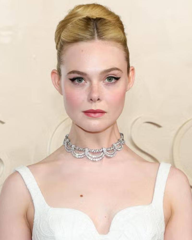 Dengan rambutnya yang ditata terikat, bergaya sanggul mawar yang elegan, make up dan rambut Fanning menunjukkan penampilan anggun yang sesungguhnya.