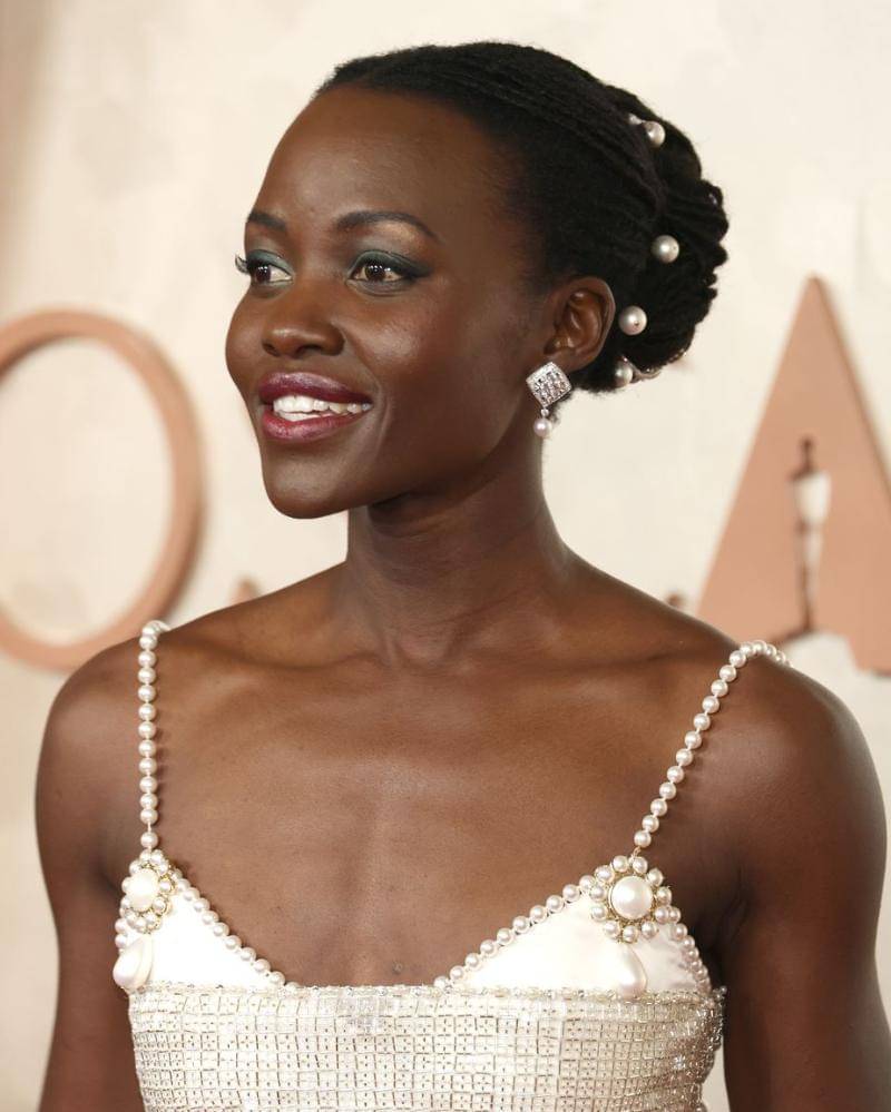 Terinspirasi oleh detail mutiara pada gaun Chanel Lupita Nyong'o dan kemewahan peragaan busana Chanel tahun 90an, tim glamornya menciptakan tampilan Oscars yang memukau. Vernon Francois menambahkan sentuhan mutiara pada rambutnya yang disanggul.