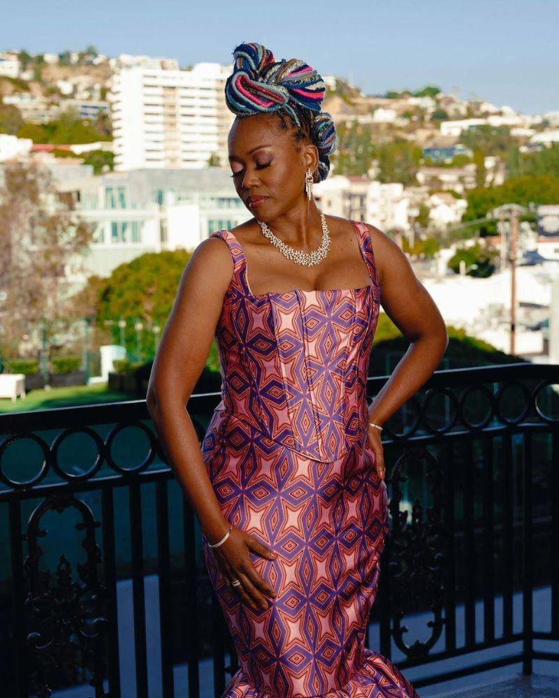 Erika Alexander, bintang American Fiction, tampil dengan box braids panjang dan berwarna, diikat simple dalam gaya top knot, dengan matanya yang menjadi pusat perhatian.