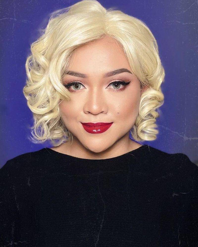 Agar penampilannya lebih mirip dengan Marilyn Monroe, Janes CS tak lupa mengenakan wig pirang bergelombang yang sangat khas dengan aktris asal Amerika tersebut.