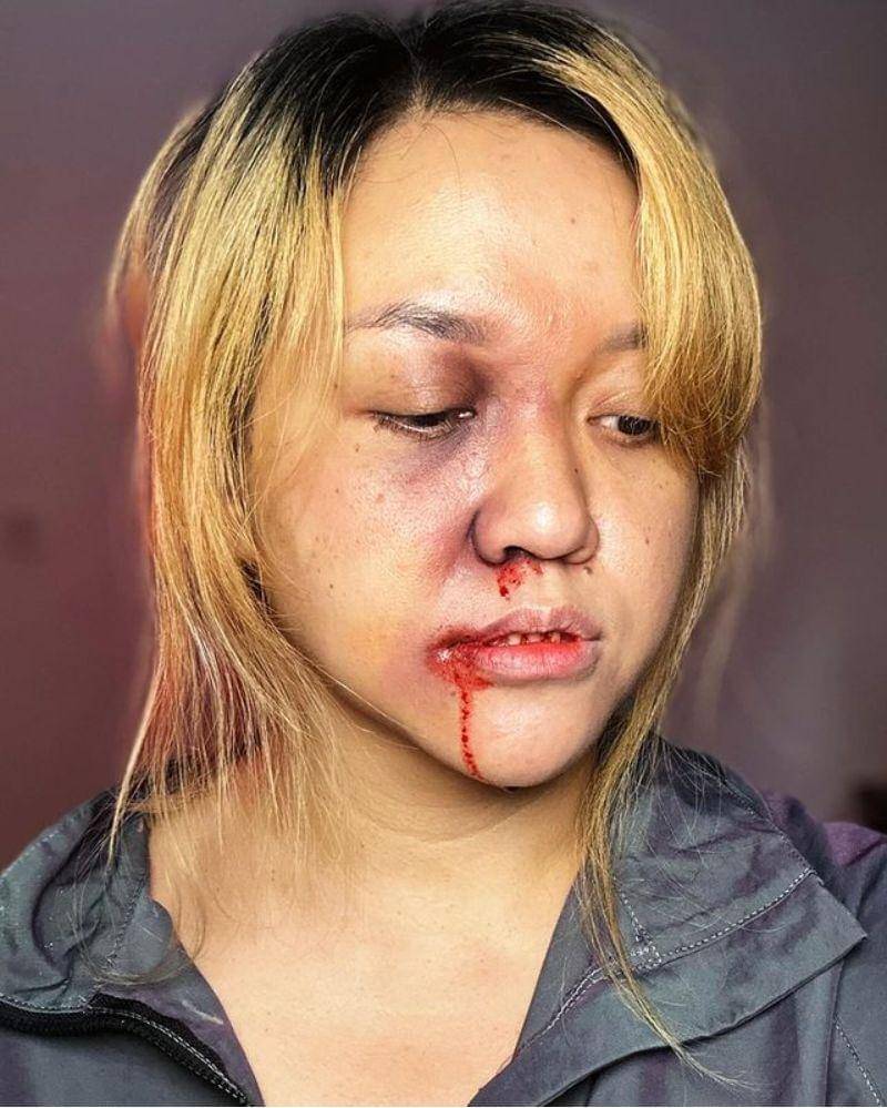 Pada makeup halloween satu ini, Janes memilih complexion yang dibuat setipis mungkin, dengan riasan warna ungu yang menyerupai luka lebam di area dekat mata dan bibirnya.