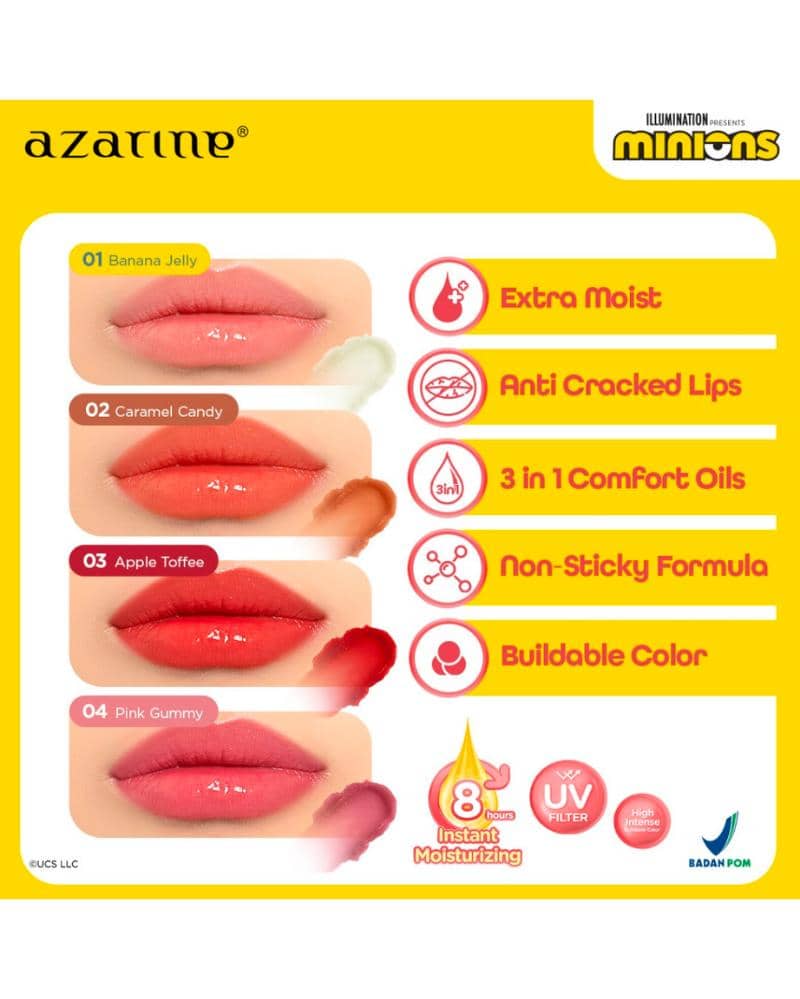 Tersedia dalam 4 pilihan warna menarik yaitu, Banana Jelly, warna bening untuk tampilan natural. Caramel Candy, warna nude hangat dengan sentuhan peachy coral. Lalu, Apple Toffee, warna merah klasik dengan undertone netral. Serta, Pinky Gummy yaitu warna pink netral dengan sentuhan mauve.
