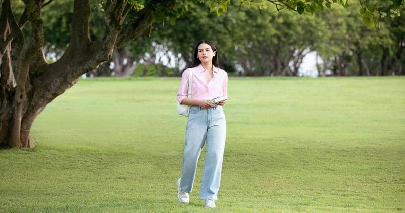 Jeans ini nyaman digunakan karena cukup longgar namun tetap memberikan siluet lekuk tubuh yang indah. Untuk atasannya, Ia memadukannya dengan kemeja extra fine cotton lengan panjang dari Uniqlo yang memberikan kesan elegan.