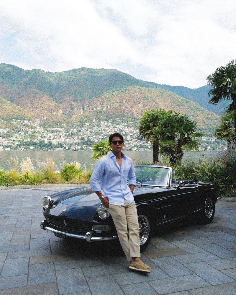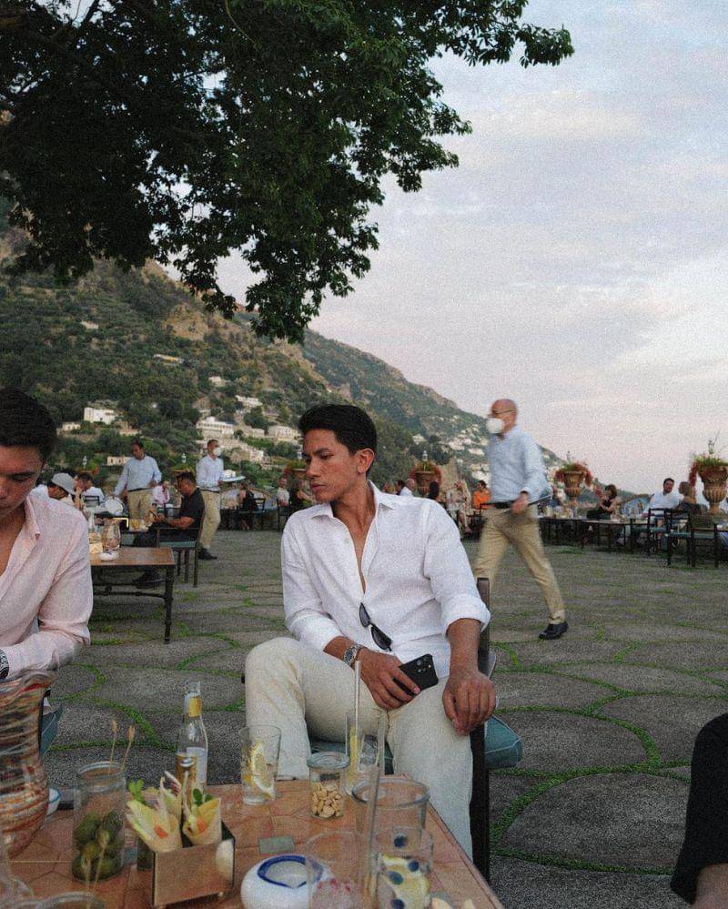 Tampak bersantai bersama teman di Amalfi Coast, Italia, Pangeran Abdul Mateen bergaya kasual dengan memakai kemeja lengan panjang warna putih. Lengan bajunya dilipat hingga siku dan kancing baju dibiarkan terbuka hingga bagian dadanya terekspos.