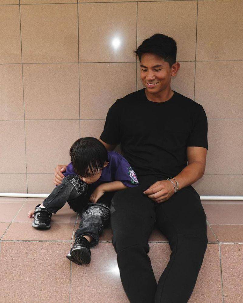Duduk santai bersama seorang anak kecil, Pangeran Abdul Mateen terlihat lebih santai dengan memakai outfit serba hitam berupa T-shirt dan celana panjang.