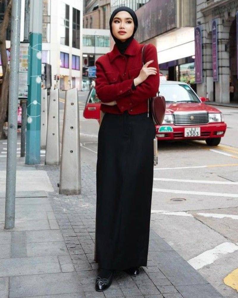 Paduan warna merah dan hitam memang menjadi pilihan banyak orang, yang memberikan kesan mewah. Blazer berwarna maroon, dengan bahan nyaman, dan detail saku serta kancing ini, bisa kamu padukan dengan rok hitam polos yang panjang. Gaya ini cocok juga untuk para pengguna hijab. Tapi, kalau kamu tidak mengenakan hijab, busana satu ini juga cocok-cocok saja untukmu.