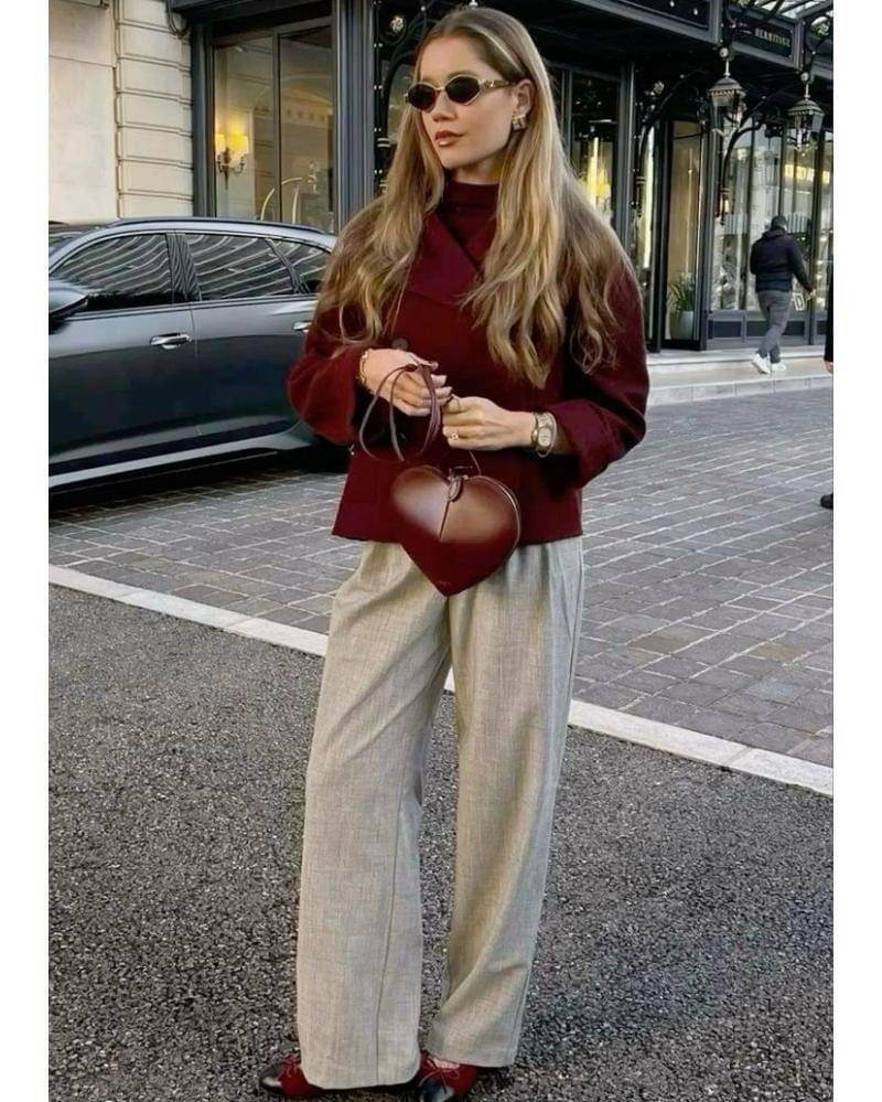 Paduan warna maroon dan krem, memberikan gaya yang elegan. Tambahkan tas berbentuk hati, untuk menambahkan kesan fun. Atau tas berstruktur kaku, untuk memberikan kesan serius dan profesional.