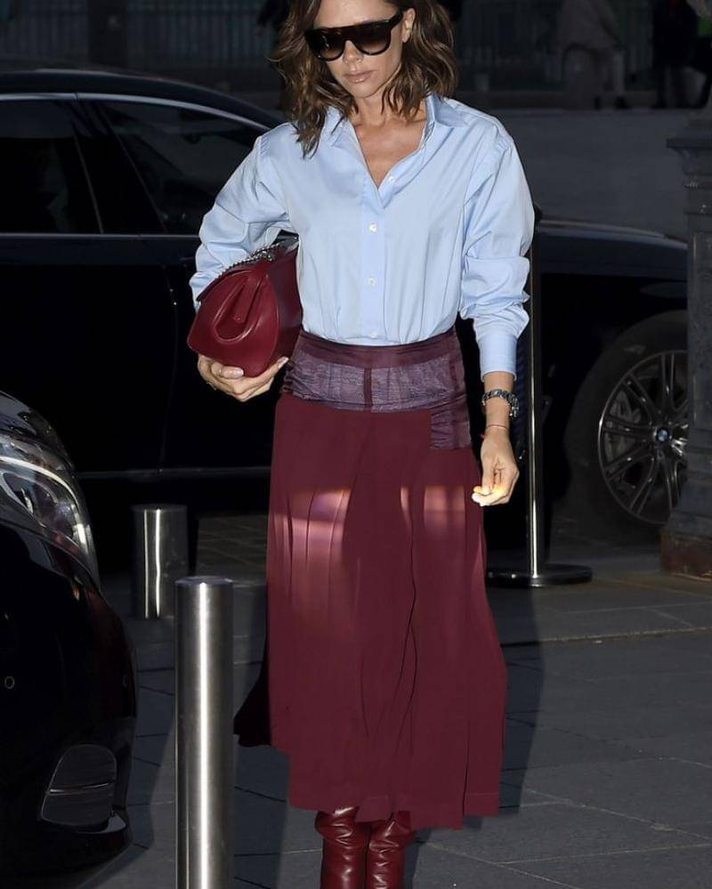 Kalau Mama senang memakai busana dengan warna cerah, coba padukan kemeja biru terangmu, dengan rok merah maroon, deh. Gaya ala Victoria Beckham ini tidak akan gagal membuat kamu tampil lebih fashionable.