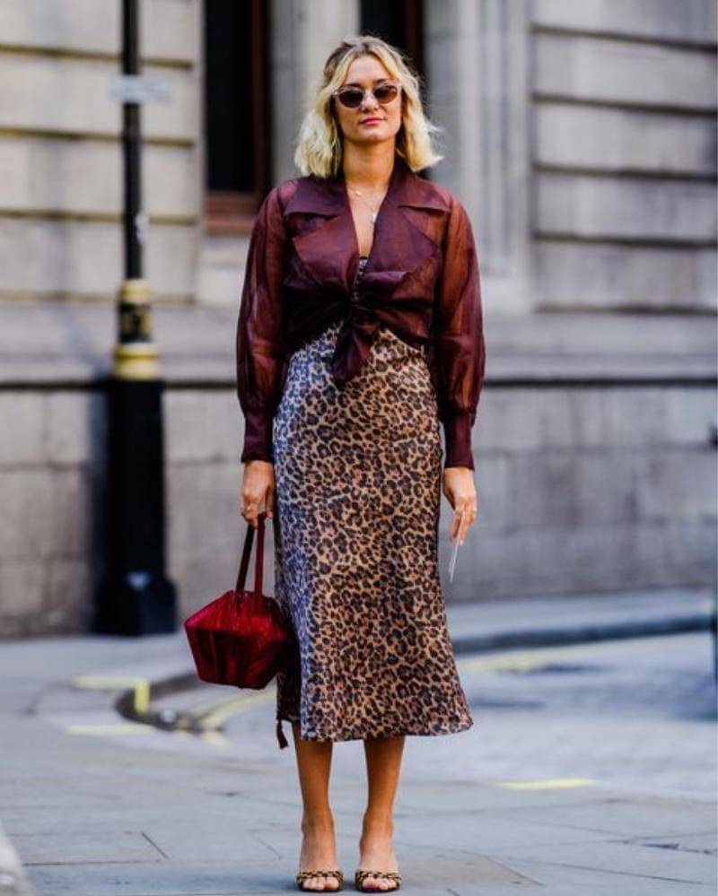Busana yang satu ini cocok untuk kamu yang ingin tampil menonjol, atau suka dengan pola macan tutul. Ensemble busana ini sebetulnya mudah untuk kamu ikuti. Padukan saja, dress midi berpola dengan kemeja merah maroon, lalu tanpa mengancingkan kemeja, ikatlah bagian tengahnya, membuat simpul.