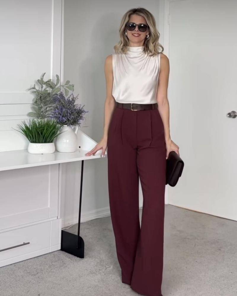 Kalau kamu ingin tampil sedikit lebih glamor, namun tidak ingin terlalu berlebihan, Mama bisa ambil inspirasi dari gaya ini. Siapkan atasan dengan kerah tinggi, berwarna putih, dengan efek pearly, yang membuat tampilanmu meningkat. Lalu, padukan dengan celana palazo berwarna maroon.
