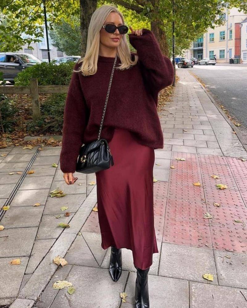 Tampilan busana ini juga cocok untuk kamu yang bekerja dan ingin hangout setelah kerja. Kesan formal bisa didapatkan dari sweater berlengan panjang, berpadu dengan rok panjang berbahan satin, dengan boots hitam pergelangan kaki.