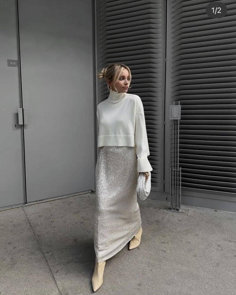 Di Natal kali ini, sequin akan jadi juaranya. Dengan aksen berkilau, penampilan kamu akan terlihat glamor dengan bawahan sequin.