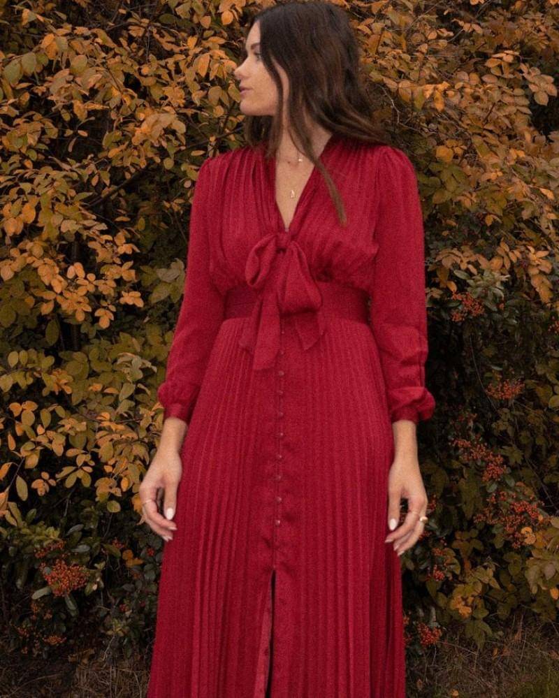 Bahan pleated masih jadi tren sampai sekarang. Jika rok pleated sudah biasa, Mama bisa memilih dress pleated sebagai pilihan baju Natal kali ini.