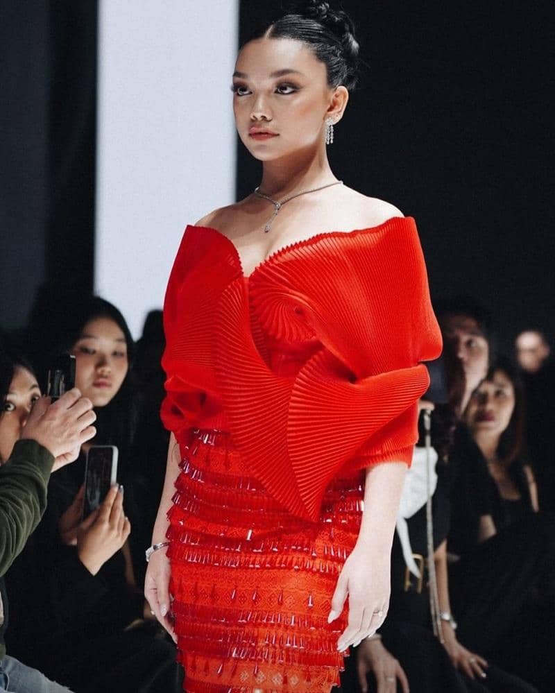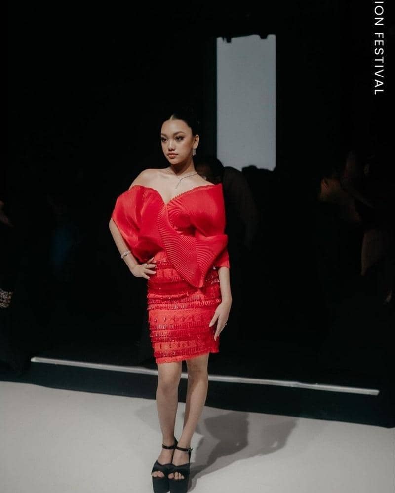 Dengan tajuk Spirit of Revival by Ernesto Abram, Naura mengenakan dress mini berwarna merah. Gaun dengan bahu terbuka ini memberikan kesan 3D yang menarik.