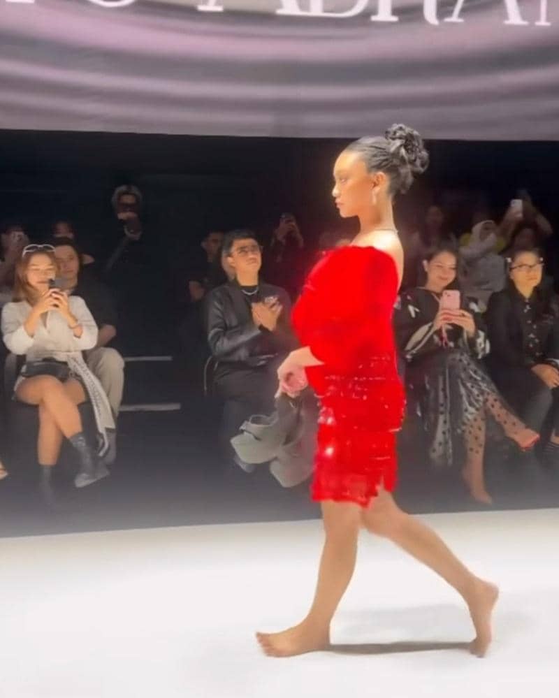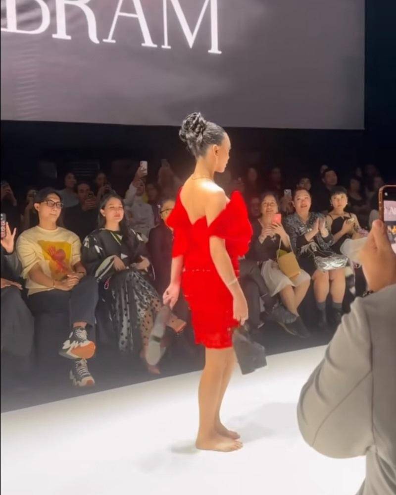 Ia pun tampil bak model profesional. Dengan air muka yang fierce, ia berjalan dengan penuh percaya diri di atas runway.