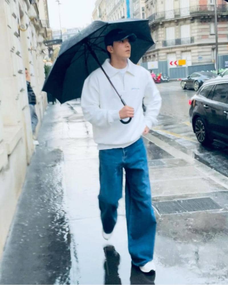 Nam Joo Hyuk juga memposting potretnya yang berjalan menyusuri jalanan di Paris. Terlihat bahwa suasana kota sedang hujan, dan Nam pun memegang payung.