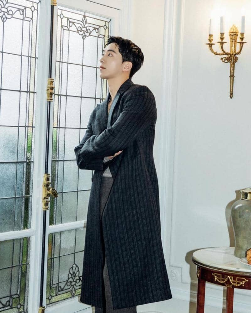 Tak hanya itu, outfit yang buat Nam lebih menonjol lagi adalah penggunaan outer panjang. Outer berwarna paduan hitam dan abu tua, dengan motif garis-garis.