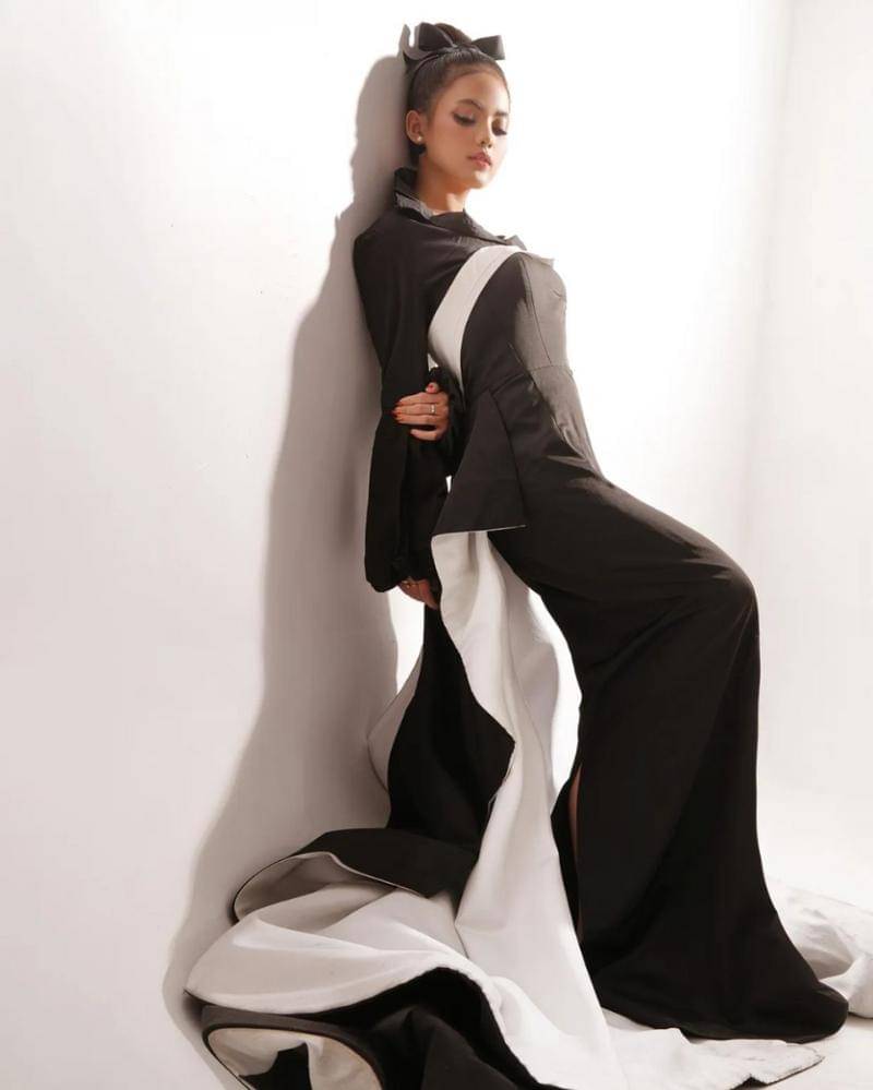 Busana Putri DA yang satu ini juga terlihat glamor. Menggunakan warna hitam dan putih, dress tersebut bermodel lengan panjang, dengan gaya peplum menambahkan kesan manis.