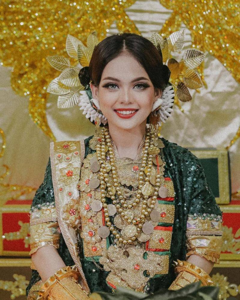 Penampilannya semakin sempurna dengan aksesoris rambut, berupa daun-daunan berwarna emas, yang ditata dengan indah. Serta, sepasang anting-anting, berlapis-lapis kalung, serta gelang masing-masing di lengannya. Semua perhiasan pelengkap busana, berwarna emas dengan ukiran-ukiran yang cantik.