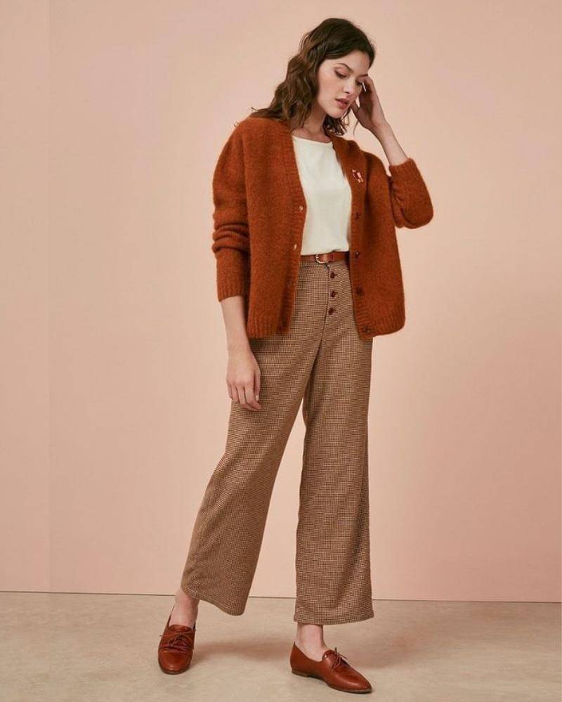 Outfit pertama yang bisa Mama coba adalah memadukan sweater rajut berwarna terracotta dengan tank top putih polos di dalamnya.