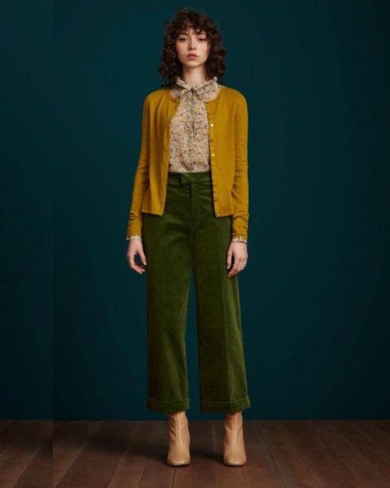 OOTD selanjutnya yang bisa Mama coba adalah memadukan sweater berwarna golden olive yang hangat dengan kemeja bermotif bunga yang memberikan sentuhan feminin dan segar.