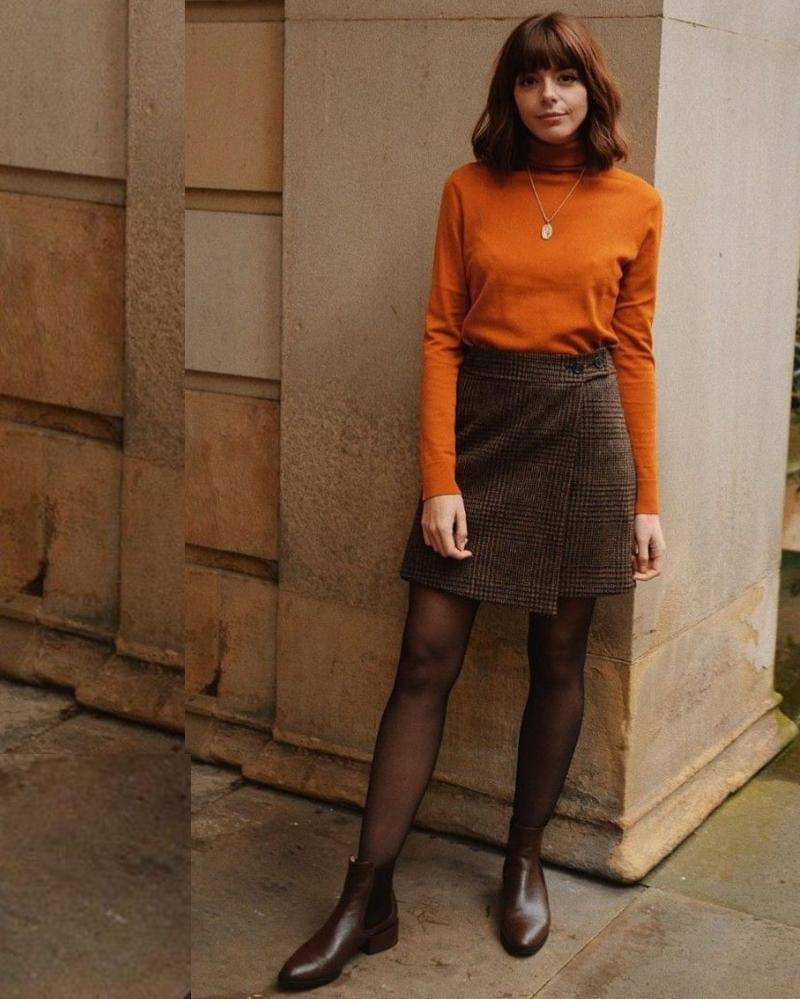 - Tampil stylish dengan rok mini, kaos polos, stocking hitam, dan sepatu boot cokelat untuk kesan praktis namun menarik.