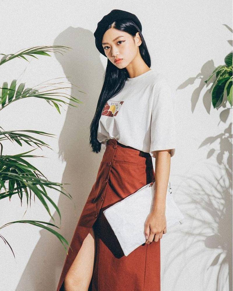 Outfit selanjutnya yang bisa Mama pilih adalah memadukan kaos putih pendek yang simpel dengan rok berwarna terracotta, yang memiliki detail belahan di bagian tengah dan kancing yang menambah sentuhan desain yang semakin stylish.