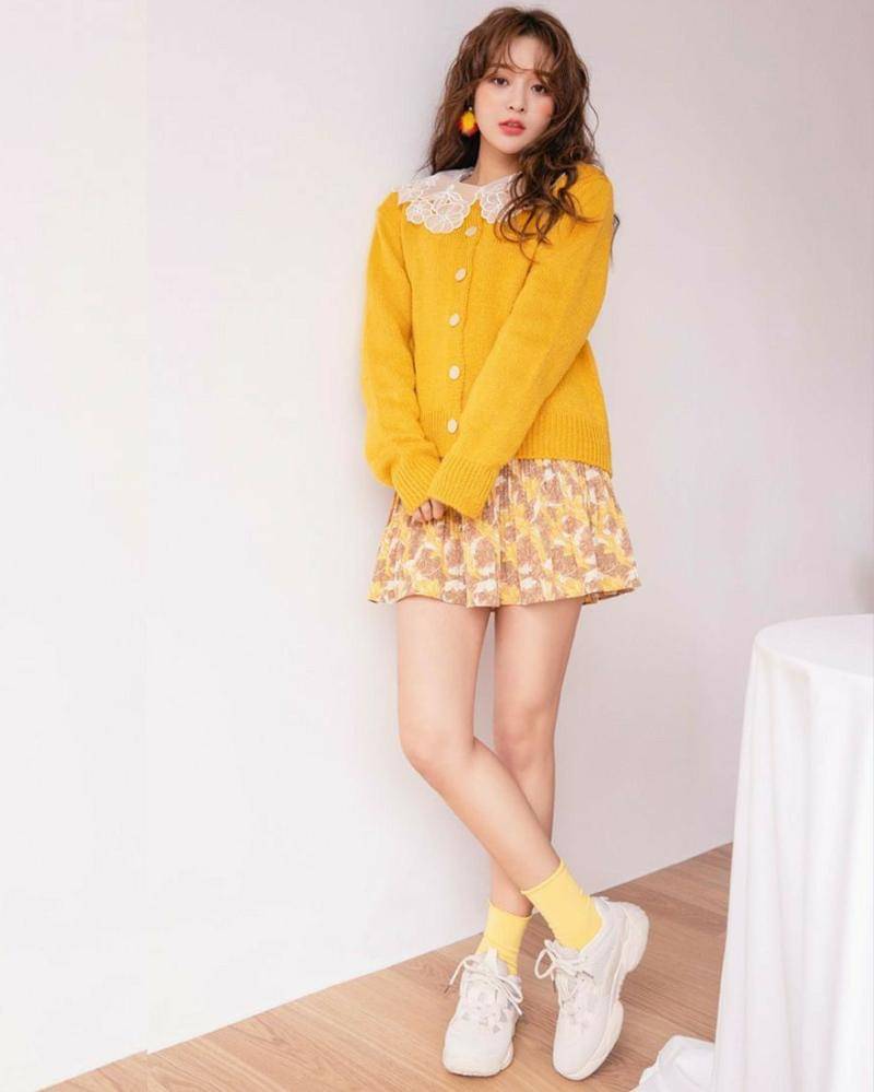 Sepatu sneakers putih yang nyaman dan kaos kaki kuning semakin melengkapi tampilan dengan kesan ceria dan playful.
