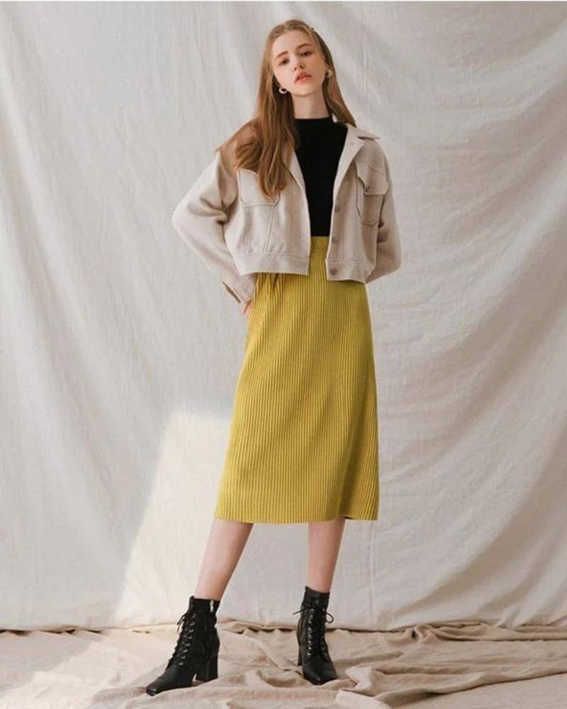Rok kuning yang jatuh di atas mata kaki memberikan sentuhan cerah yang menyegarkan, sementara sepatu boot hitam menambah kesan stylish dan tegas pada penampilan Mama.