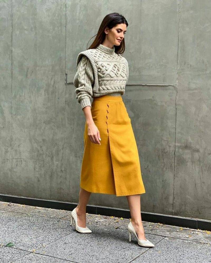 OOTD selanjutnya adalah gaya kasual yang memadukan sweater rajut tebal berwarna hijau army dengan rok kuning yang sedikit di atas lutut.