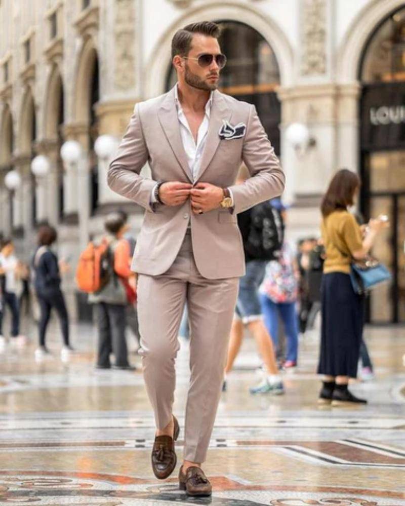 Lengkapi busana dengan jam tangan kulit yang ramping dan sepatu loafer cokelat klasik untuk perayaan cinta yang anggun dan bergaya.