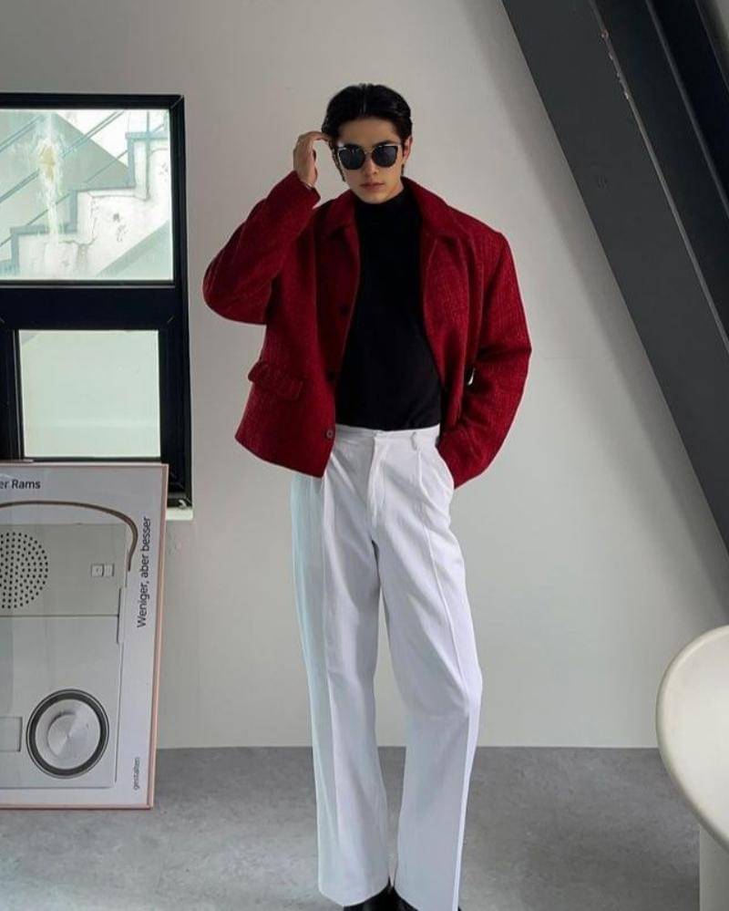Kenakan dasar busana berwarna netral, seperti atasan turtleneck hitam, dimix & match dengan celana panjang berwarna putih. Lalu, tambahkan outer merah yang menonjol tapi bergaya kasual. Tutup dengan sepasang sepatu formal, seperti sepatu pantofel berwarna hitam.