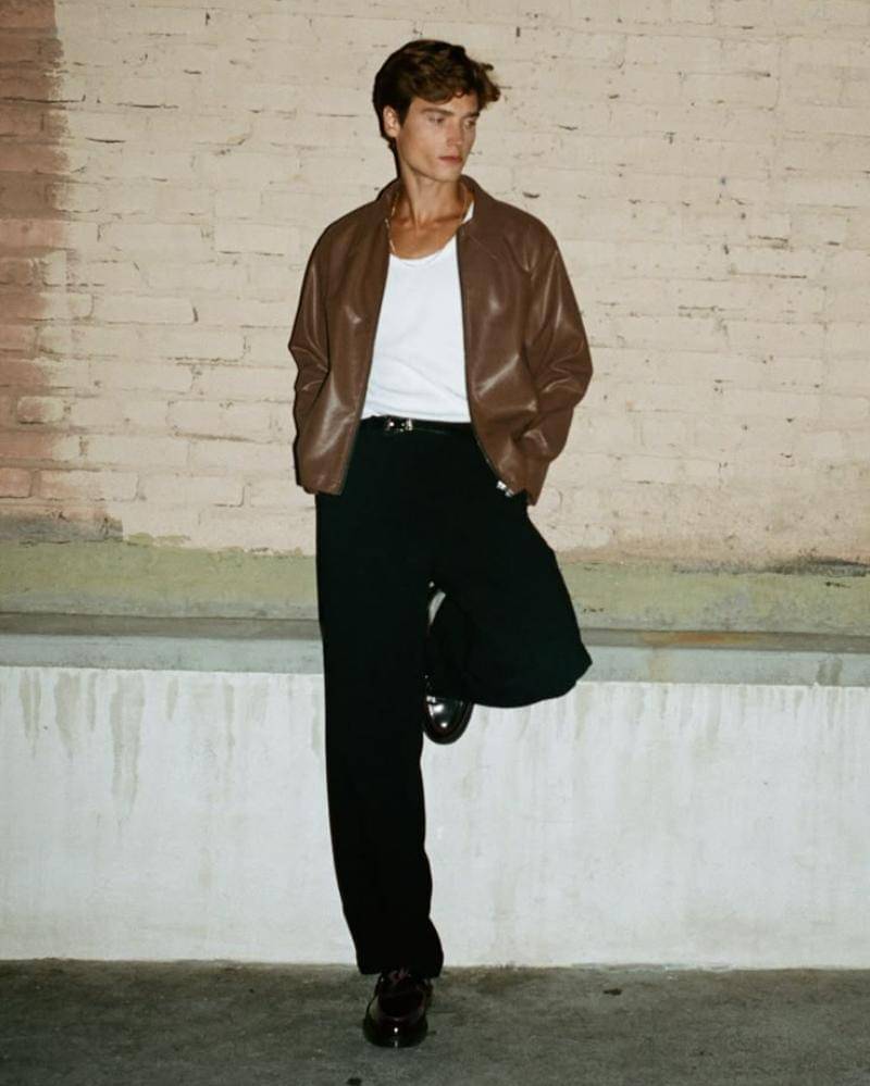 Kamu juga bisa berpakaian sederhana tetapi tetap menarik dengan menggunakan jaket kulit, lho. Dapatkan tampilan yang satu ini dengan mix & match dalaman berupa tank top putih, dengan celana panjang yang beri kesan rapi.